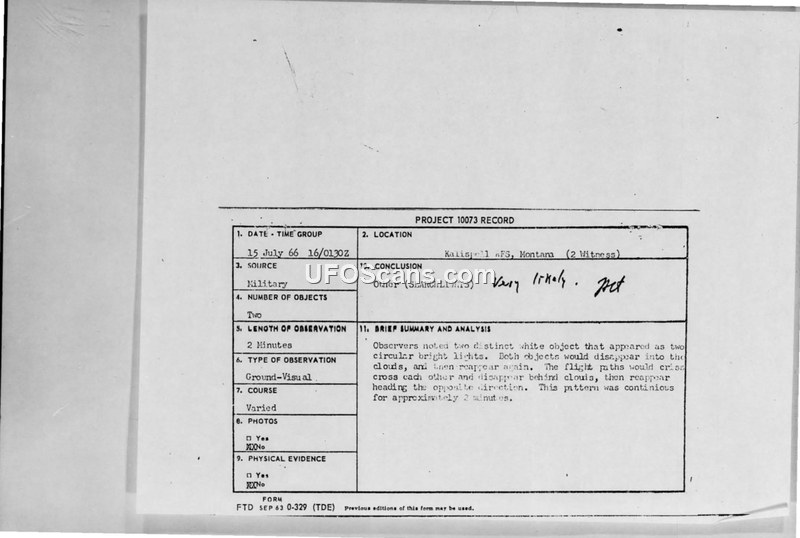 Project 10073 Record — UFO Sighting, Lakeside, Montana, 15 July 1966