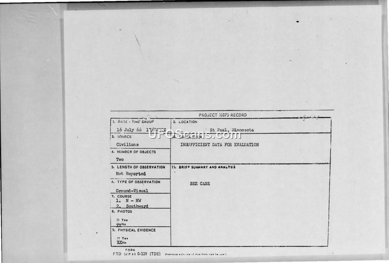 A group of civilians in St. Paul, Minnesota, reported sightings of unidentified aerial objects on July 16 and 17, 1966. The Air Force, through Major Hector Quintanilla, Jr., requested Dr. J. Allen Hynek to investigate the case while maintaining confidentiality.
