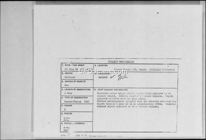 Project 10073 Record: Sighting at Ernest Harmon AFB, Canada, 17 July 1966