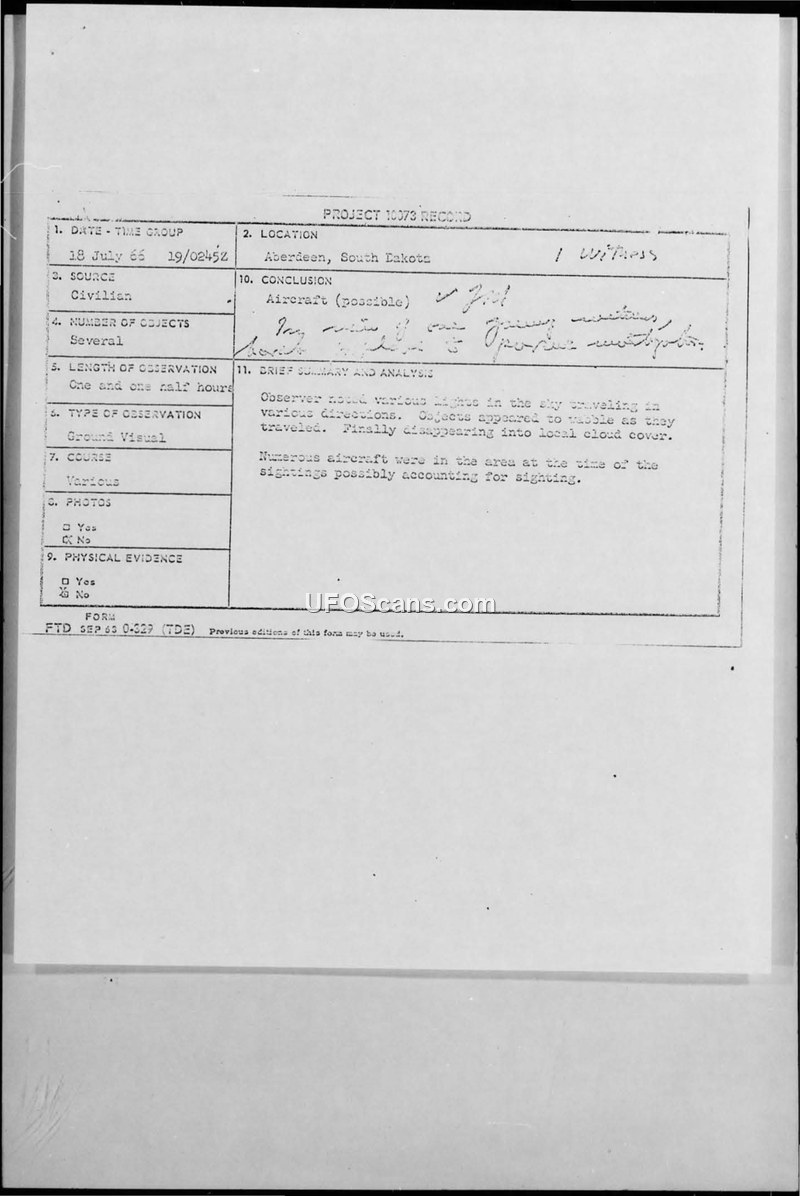 A civilian reported a UFO sighting in Aberdeen, South Dakota, on 18 July 1966. The Air Force investigated and concluded the lights were likely caused by aircraft in the area.