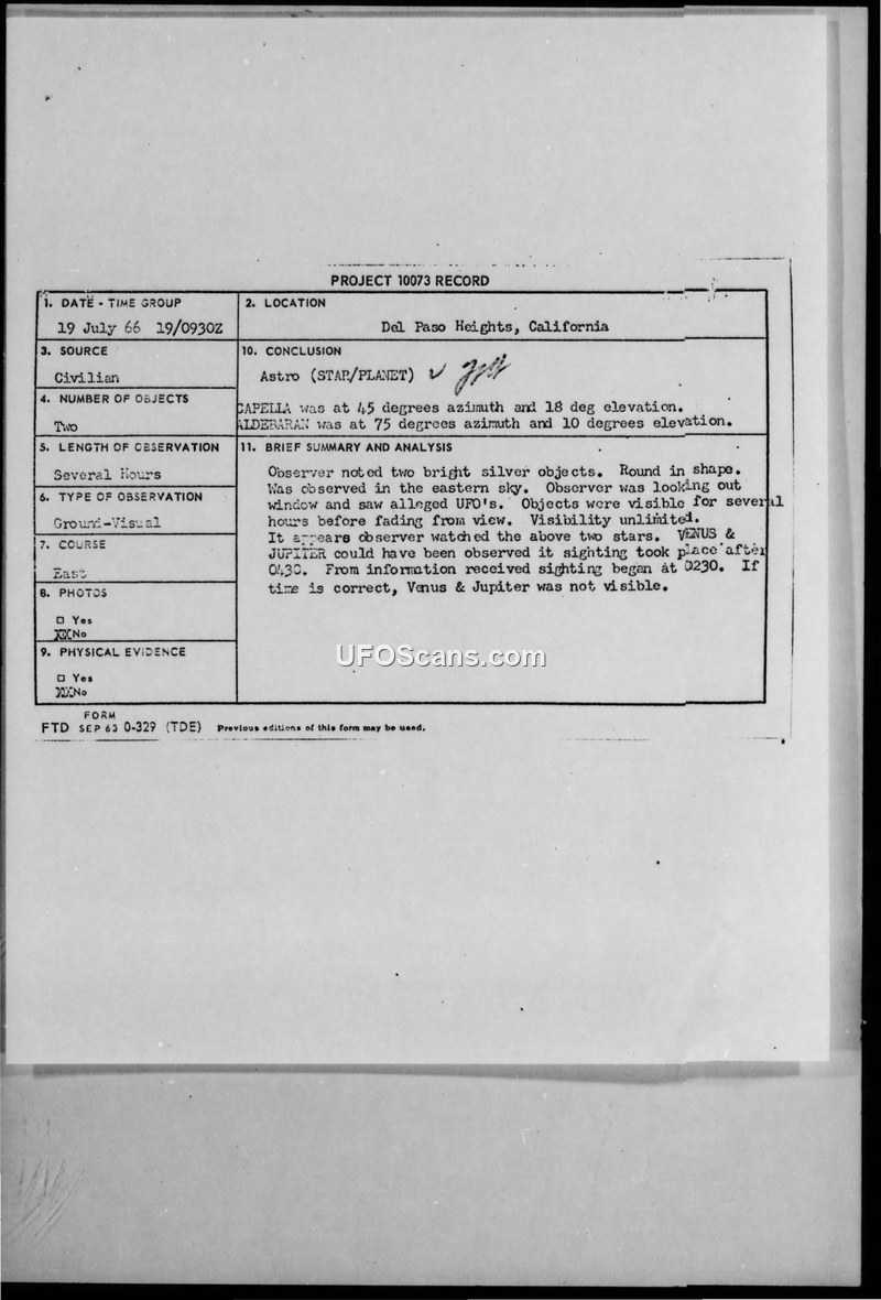 A civilian report of two bright silver objects in Del Paso Heights, California, was investigated by the Air Force. The military concluded the sighting was likely an observation of Jupiter and another planet, noting the humming sound could not be explained.