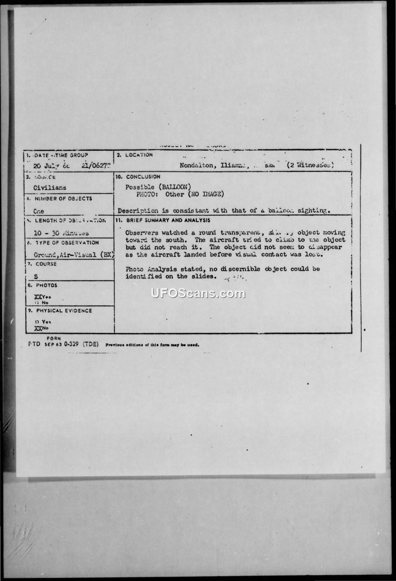 This document details a UFO sighting that occurred on 20 July 1966 in the vicinity of Nondalton and Iliamna, Alaska. The report, compiled by the Alaskan Air Command and forwarded to the Foreign Technology Division (FTD) at Wright-Patterson AFB, describes a round, transparent, silvery object approximately 8 feet in diameter. The object was observed by multiple witnesses, including a professional pilot with 12 years of experience and the Chief of the Iliamna Flight Service Station. The object was reported to have the capability to hover, move against the wind, and climb or descend at rates comparable to a Cessna 180 aircraft. The sighting lasted for 10 minutes at Nondalton and 30 minutes at Iliamna. The witness in the aircraft attempted to intercept the object, but it moved away and was not seen to disappear before visual contact was lost. The Air Force investigation concluded that the description was consistent with a balloon, possibly a weather balloon, although no agency in the region claimed ownership of such a device. Photographic evidence in the form of 35mm slides was submitted, but the FTD analysis determined the value of the film to be negligible due to the lack of a discernible object on the slides. The document includes correspondence between the Alaskan Air Command and FTD regarding the request for technical details of the photography, as well as a separate, unrelated report from a civilian in North Carolina regarding a different sighting.