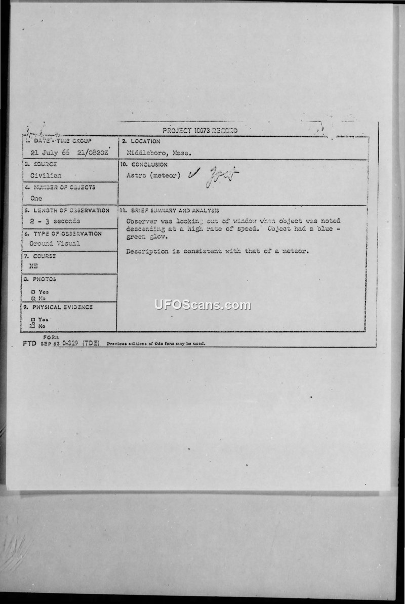 Project 10073 Record — Middleboro, Mass. 21 July 1966