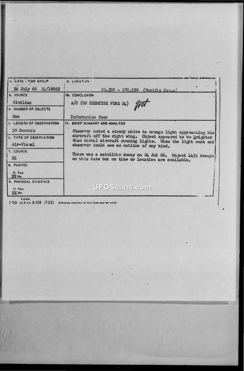 A TWA flight reported an unidentified light over the Pacific on 24 July 1966. Military authorities concluded the sighting was likely a satellite reentry.