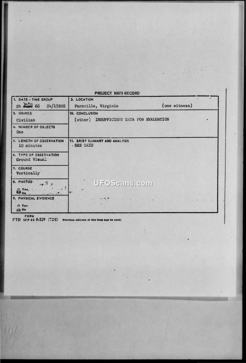 A civilian in Farmville, Virginia, reported a 10-minute sighting of an unidentified object on 24 July 1966. Project Blue Book determined the report contained insufficient data for evaluation and requested further information via a standard questionnaire.