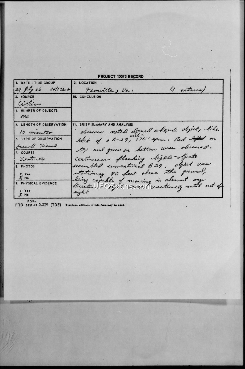 Project 10073 Record: Sighting Report - Farmville, Virginia, 24 July 1966