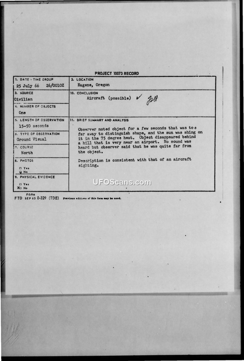 Project 10073 Record — Eugene, Oregon, 25 July 1966
