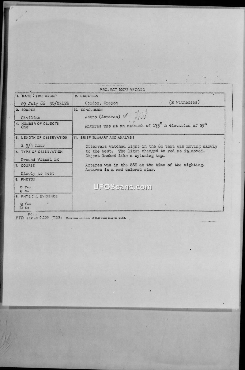 A 1966 Air Force report documents a civilian sighting of a light in the sky near Condon, Oregon. The investigation concluded the object was the star Antares.