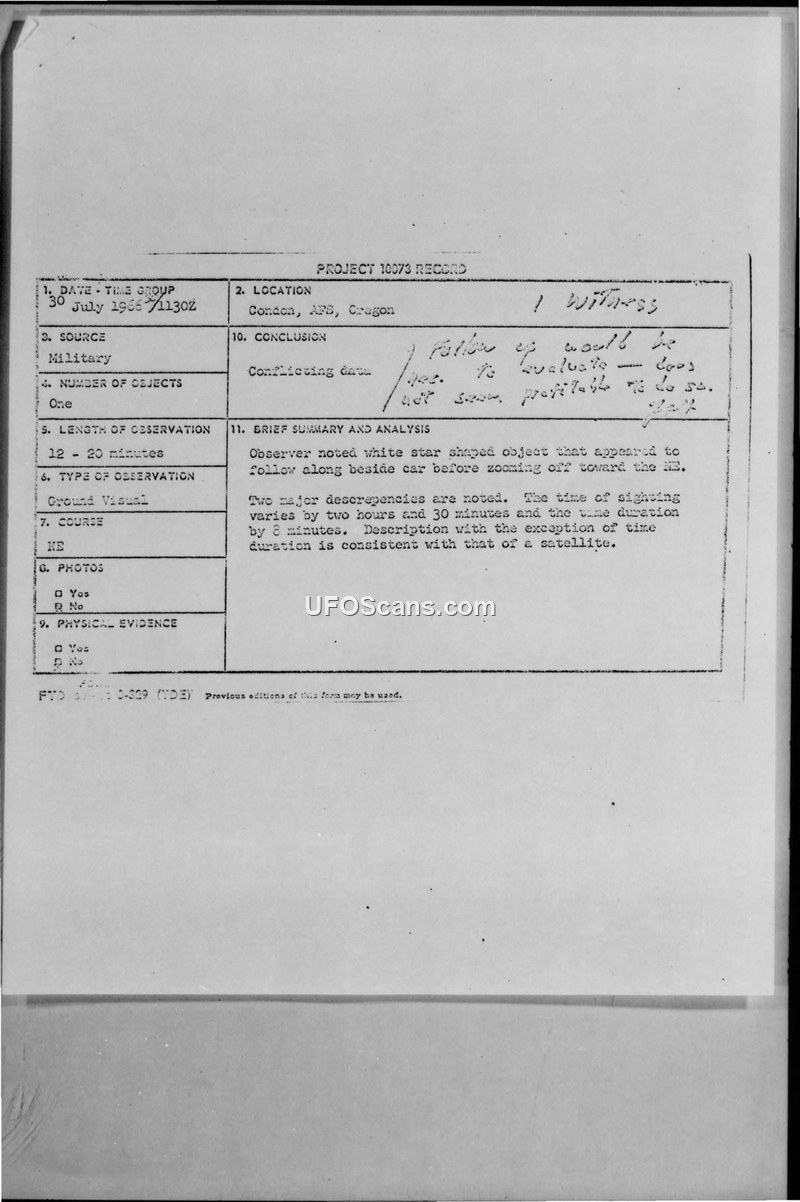 Project 10073 Record: Sighting Report - Condon, AFS, Oregon, 30 July 1966