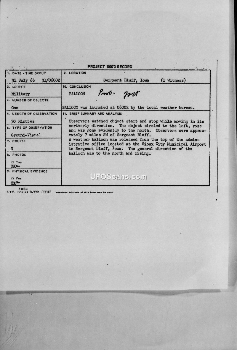 A 30-minute UFO sighting in Sergeant Bluff, Iowa, on 31 July 1966 was officially identified by the Air Force as a weather balloon released by the local U.S. Weather Bureau.