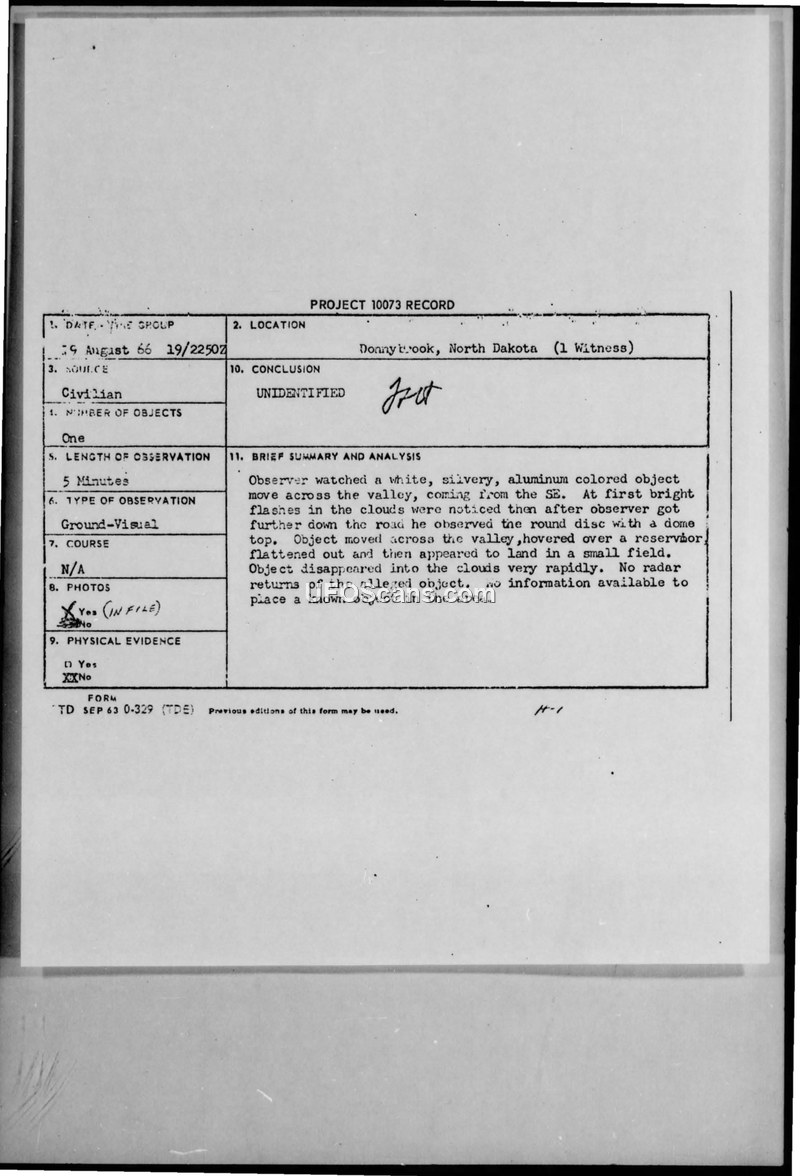 A U.S. Border Patrol agent reported a 30-foot disc-shaped object near Donnybrook, North Dakota, on 19 August 1966. The Air Force investigation found no radar evidence and attributed physical ground traces to local wildlife.