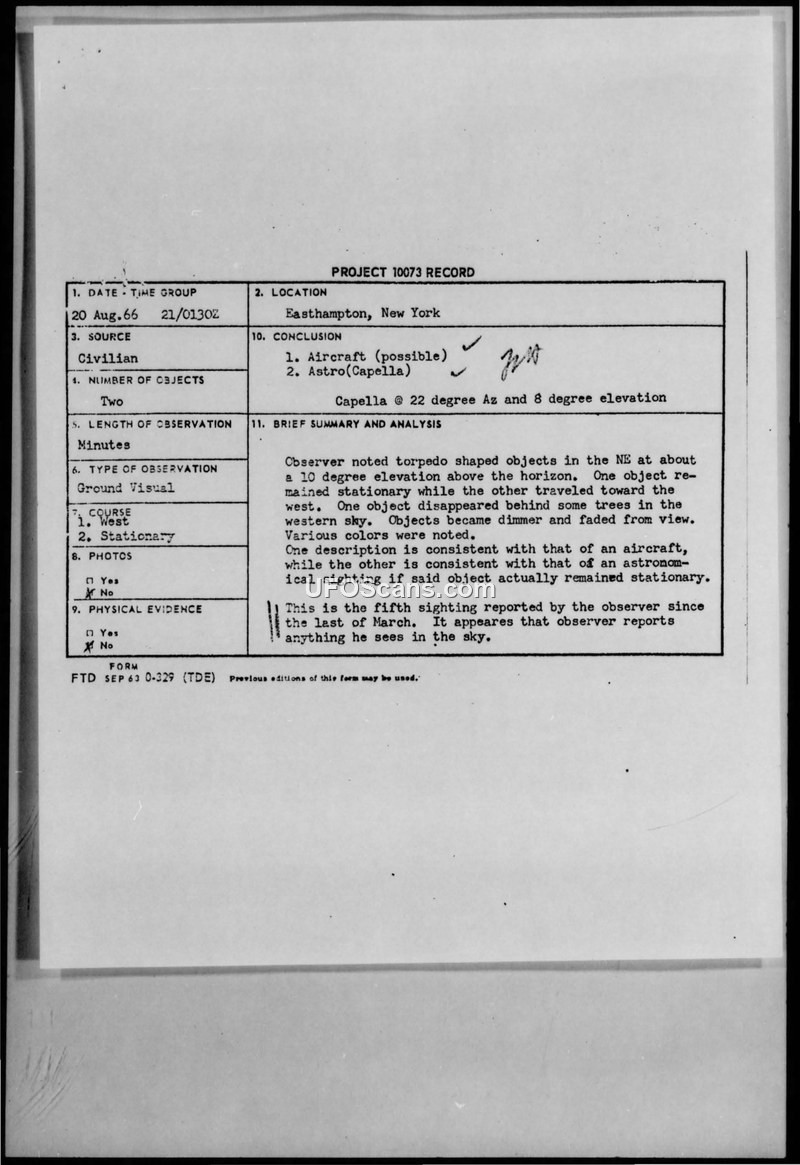 Project 10073 Record — Easthampton, New York, 20 August 1966
