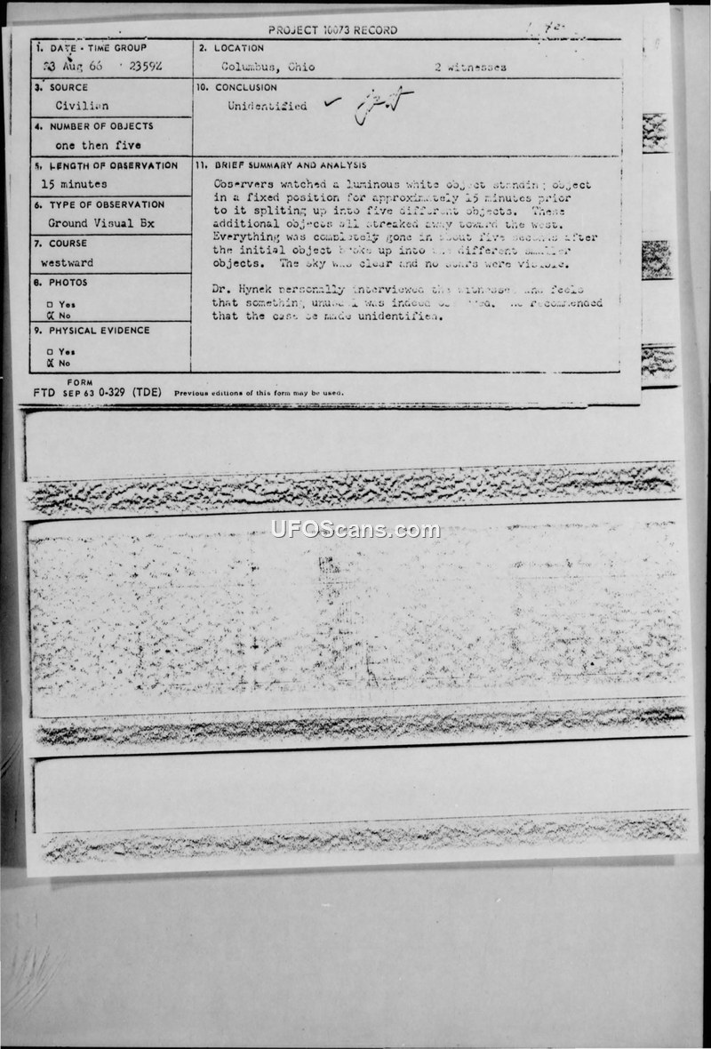 A credible witness in Columbus, Ohio, observed a stationary luminous object that split into five smaller objects on 23 August 1966. Dr. J. Allen Hynek investigated the case and concluded it remained unidentified, recommending further public inquiry to assist in triangulation.