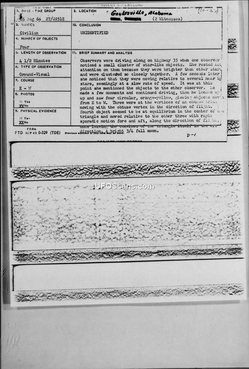 An aerospace engineer and his family reported observing four glowing, circular objects in a triangular formation over Gaylesville, Alabama, on August 26, 1966. The Air Force investigated the incident but was unable to identify the objects, ultimately classifying the case as unidentified.