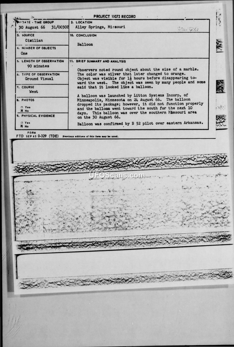 This document is a collection of records, including an official Project 10073 sighting report and subsequent internal Air Force communications, regarding a UFO sighting in Alley Springs, Missouri, on 30 August 1966. Witnesses reported a round, marble-sized object that appeared silver and changed to orange, remaining visible for 90 minutes before moving west and disappearing. The object made no sound and left no trail. The Air Force investigation concluded that the object was a malfunctioning weather balloon launched by Litton Systems Incorp. from Minneapolis, Minnesota, on 24 August 1966. The balloon had dropped its package but failed to deflate, drifting over the Missouri, Arkansas, and Tennessee area for approximately ten days. The report includes detailed logs of contacts with various agencies, including the FAA, NCAR, and Litton Systems, to track the balloon's flight path. Pilots from the 97th Bombardment Wing were also consulted, and one pilot, Captain Warren J. Herrig, reported being advised to look for the balloon while flying near St. Louis. The investigation also ruled out satellite sightings, noting that while Echo I, Echo II, and Pegasus-A were visible during that week, none were present at the time of the sighting. The Air Force ultimately determined the sighting was explained by the presence of this free-drifting weather balloon.