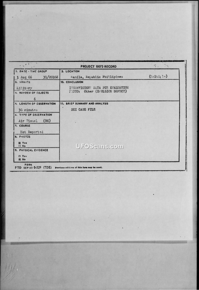 Project 10073 Record: UFO Sighting, 1 August 1966, Philippines