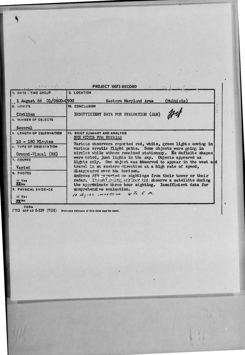 Project 10073 Record: Eastern Maryland Area Sightings, 1 August 1966