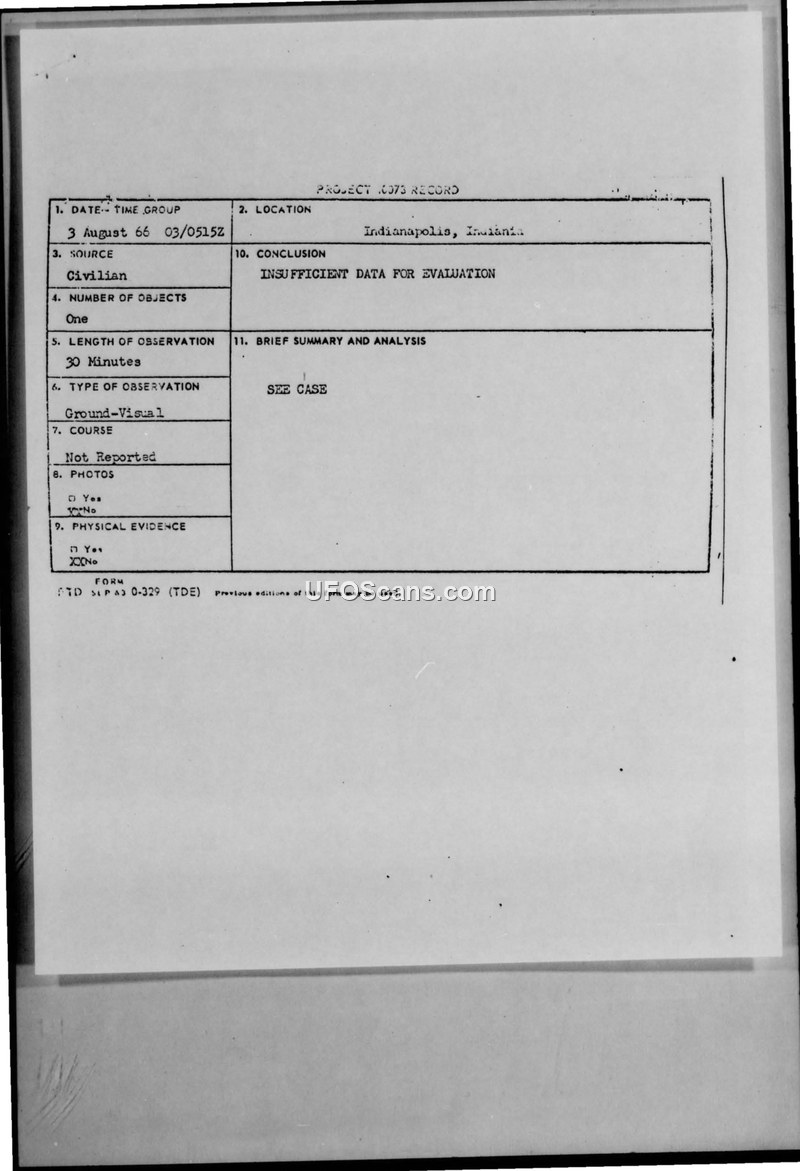 Project Blue Book Sighting Report — Indianapolis, Indiana, 3 August 1966