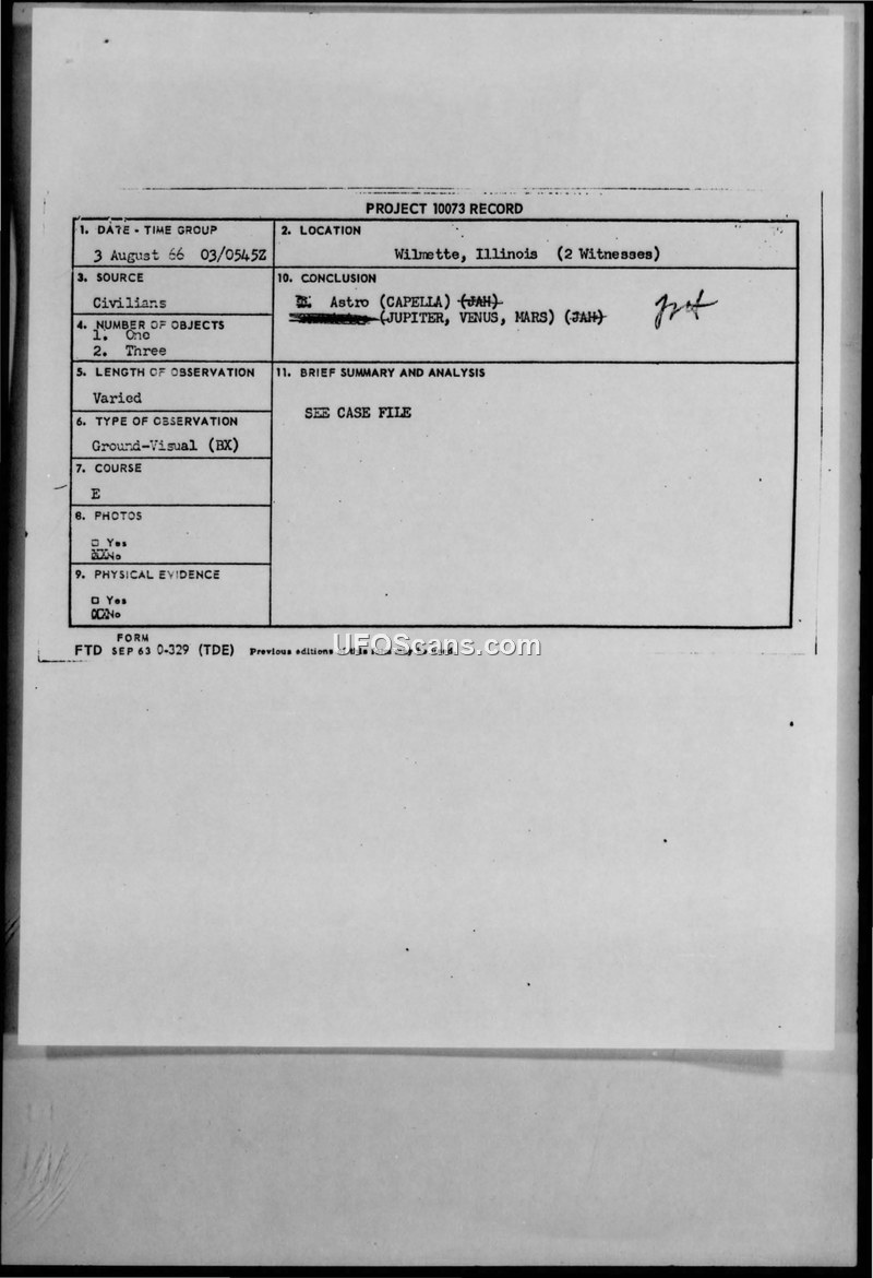 Project 10073 Record: Sighting of August 3, 1966, Wilmette, Illinois