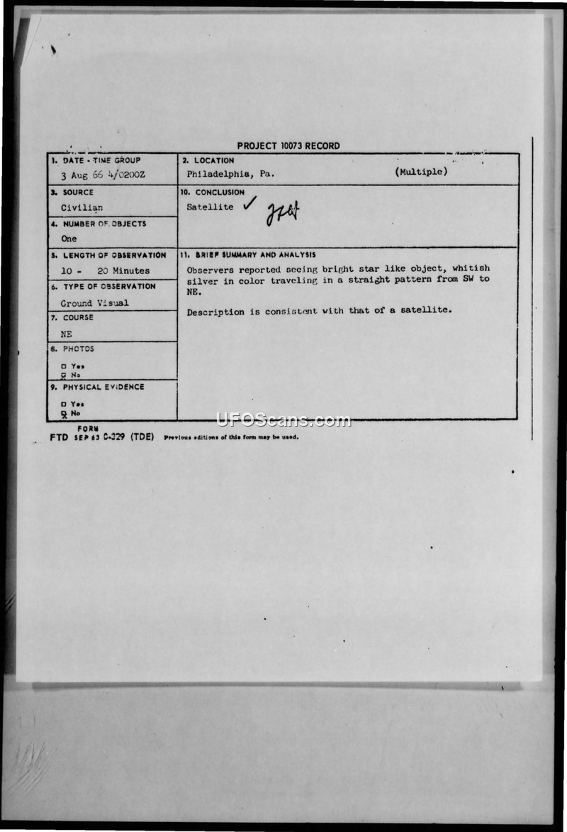 Project 10073 Record: Sighting Report - Philadelphia, PA, 3 August 1966