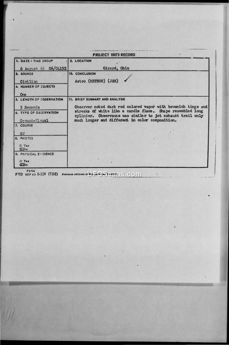 A civilian sighting report from Girard, Ohio, on August 6, 1966, was officially classified by Project Blue Book as a meteor. The file also contains a separate report of a B-52 aircraft mistaken for an unidentified object in Dayton, Ohio.