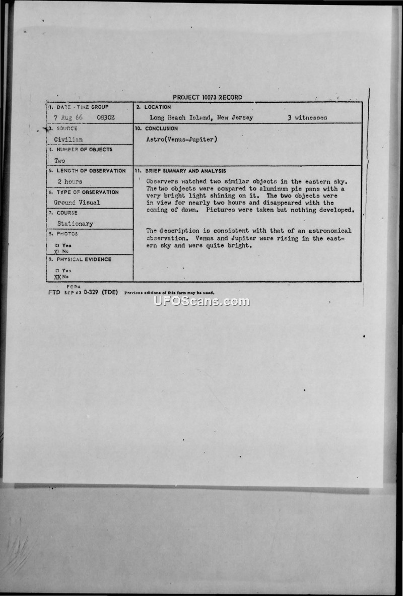 A civilian report of two stationary, bright objects over Long Beach Island, NJ, on August 7, 1966. The Air Force concluded the sighting was an astronomical observation of Venus and Jupiter.