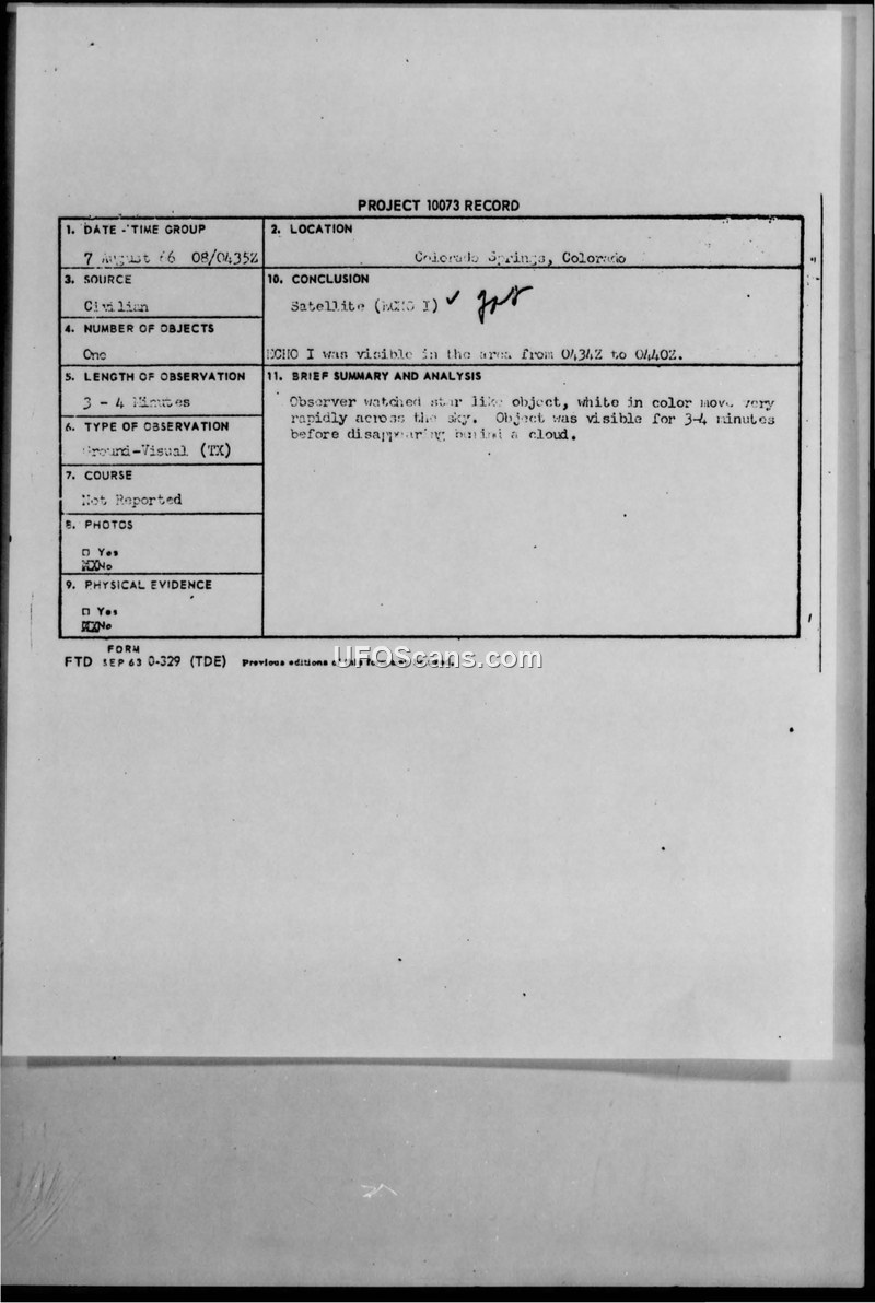 Project 10073 Record: Sighting Report - Colorado Springs, Colorado, 7 August 1966