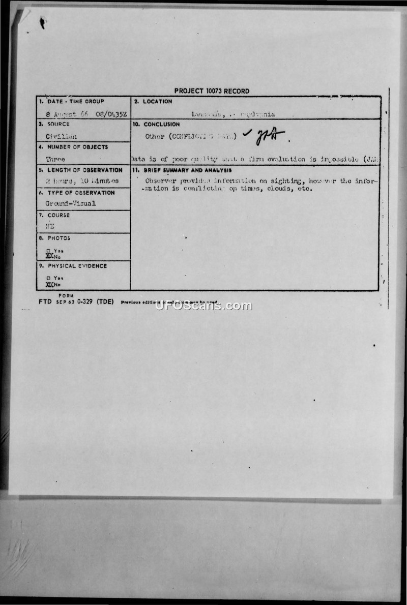 This document is a collection of Project 10073 records and related correspondence from August 1966, managed by the Foreign Technology Division (FTD) and Project Blue Book. The records consist of numerous individual sighting reports of Unidentified Aerial Phenomena (UAP) across the United States. Each report typically includes a standard Project 10073 record form, which documents the date, time, location, source, number of objects, duration, and type of observation, followed by a brief summary and analysis by Air Force investigators. Many of these reports were followed up with correspondence from Major Hector Quintanilla, Jr., requesting that witnesses complete FTD Form 164 for further evaluation. The conclusions reached by the Air Force investigators vary, with many sightings being attributed to satellites, flares, or conventional aircraft. For instance, several reports were identified as the ECHO I satellite, while others were determined to be flares or military aircraft refueling operations. The document also includes newspaper clippings and letters from citizens describing their sightings, often expressing curiosity or concern. One notable incident involved a report from Bardstown, Kentucky, where witnesses at a play observed lights in the sky; this was later investigated and attributed to a night refueling mission involving B-52 and KC-135 aircraft. The collection provides a detailed look at the administrative process of the U.S. Air Force in handling UAP reports during the mid-1960s, emphasizing the systematic collection of data and the attempt to provide conventional explanations for the reported phenomena.