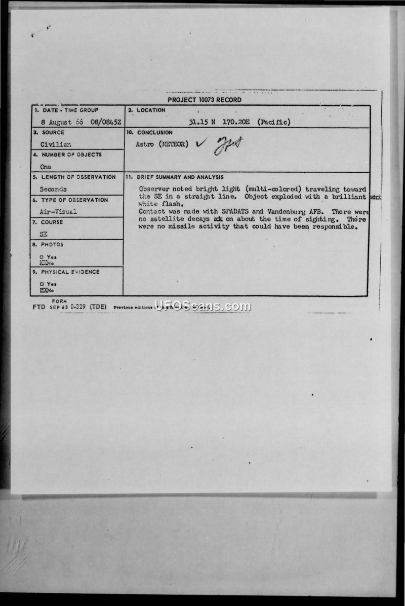 This document is a Project 10073 record concerning a UFO sighting reported on 8 August 1966 at 0845Z. A civilian observer reported a bright, multi-colored light traveling in a straight line from the Northwest to the Southeast at a position of 31.15 N 170.20E in the Pacific. The object was described as being brighter than a full moon until it ended in a brilliant white flash. The duration of the event was estimated to be a few seconds. The report includes details from a Pan American Jet Clipper 204, which was at 33,000 feet altitude at the time. Official inquiries were made to SPADATS and Vandenburg AFB, which confirmed there were no satellite decays or missile activities that could explain the event. The official conclusion reached was that the object was an 'Astro (METEOR)'. The document also contains a memorandum from the Headquarters 6486th Air Base Wing to the Air Force Systems Command (FTD) at Wright Patterson AFB, noting that the report was received too late for a thorough investigation. The Director of Intelligence for 326 ADD provided additional commentary, suggesting the event might have been a satellite or orbital debris reentry, noting it was the second such incident in the area within six weeks. Furthermore, the document mentions an informal report of a separate incident on 7 August, where a pilot on a MAC C-124 aircraft observed an object on radar traveling at approximately 3,600 N.M. with no corresponding visual sighting.