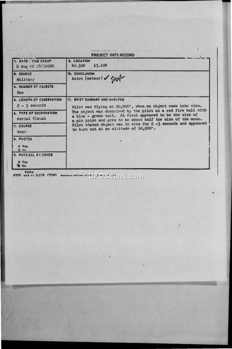 A US Navy F4H crew reported a red fireball with a blue-green tail descending over Italy on August 8, 1966. The incident was officially classified as a meteor under Project 10073.