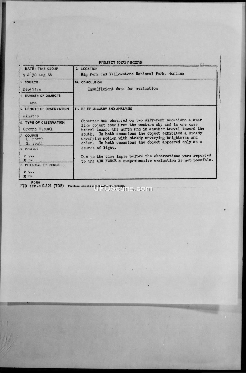 This document contains a collection of records related to two UFO sightings reported by a civilian instructor from Wisconsin State University. The witness reported observing a star-like object on August 9, 1966, in Big Fork, Montana, and again on August 30, 1966, at Old Faithful in Yellowstone National Park. In both instances, the witness described the object as self-luminous, moving with steady, unvarying motion, and exhibiting a 90-degree turn. The witness, who had been interested in UFOs since the 1947 Kenneth Arnold sighting, expressed frustration with the Air Force's official stance on UFOs, accusing the military of withholding information and radar data. The Air Force, represented by Colonel James C. Manatt, responded to the witness's correspondence on February 8, 1967. The official Air Force position, as stated in the response, was that the sightings could not be evaluated due to the significant time lapse between the events and the reporting. Furthermore, the Chief of Project Blue Book emphasized that the Air Force relies on subjective data and that no conclusive evidence of extraterrestrial visitation had been found. The records include the official Project 10073 form, the witness's detailed reports submitted to NICAP, and the subsequent correspondence between the witness and the Air Force.
