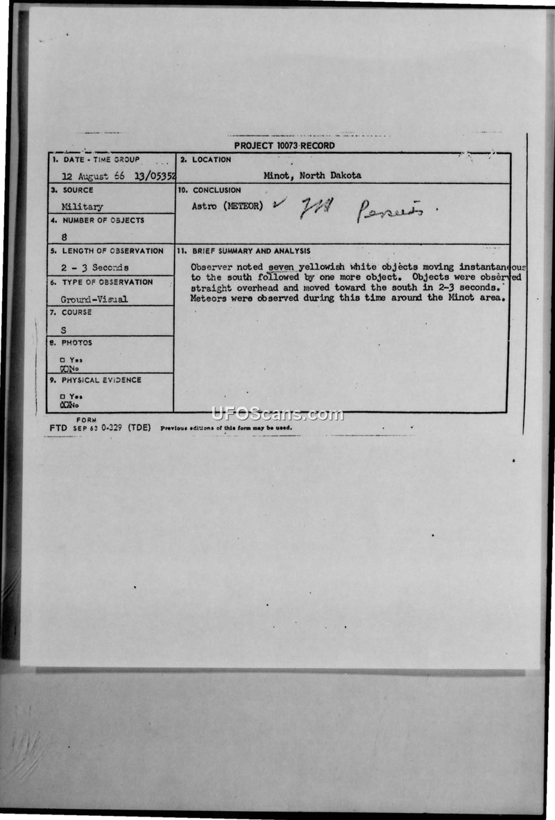 A 1966 report from Minot AFB detailing a sighting of eight disc-shaped objects by a military witness. The official conclusion identified the objects as meteors.