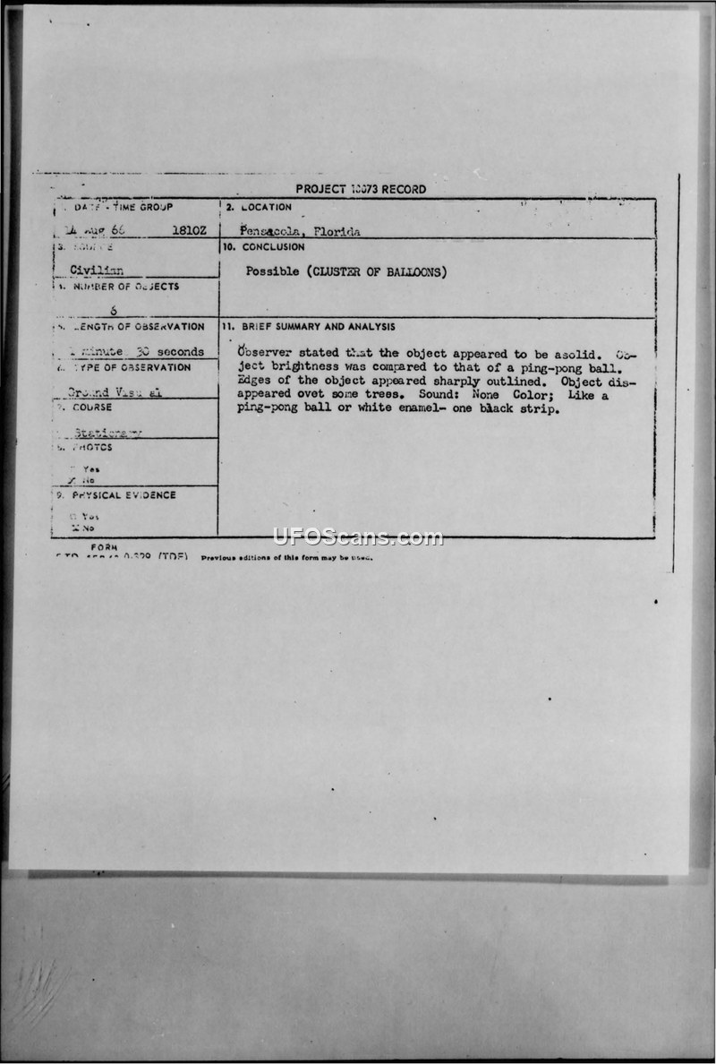 A 14-year-old witness in Pensacola, Florida, reported six white, striped, ping-pong ball-shaped objects in a 'Vee' formation on August 14, 1966. The Air Force officially classified the incident as a possible cluster of balloons.