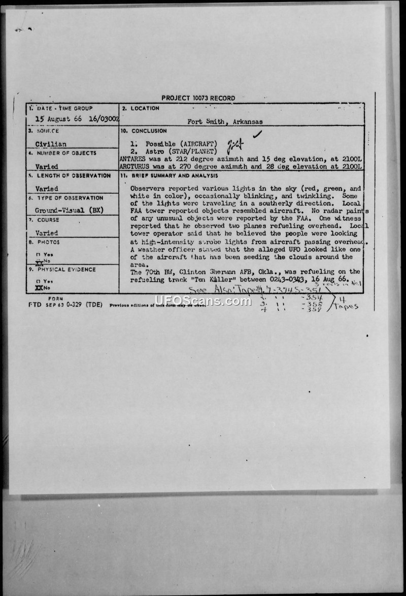 Project 10073 Record: UFO Sightings, Fort Smith, Arkansas, 16 August 1966