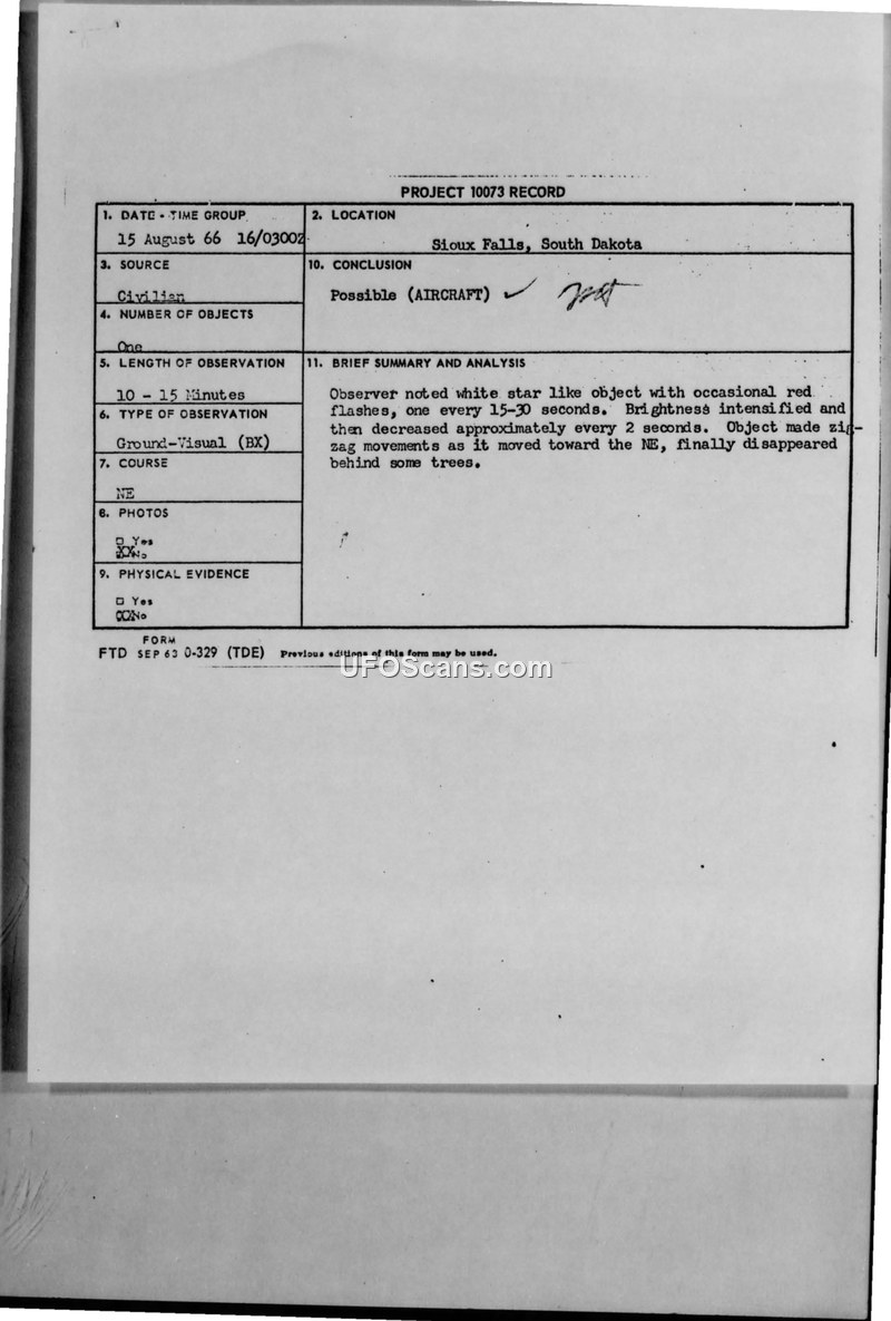 On 15 August 1966, between 0300 and 0315 Z, a high school student in Sioux Falls, South Dakota, observed an unidentified aerial phenomenon. The witness, whose reliability is noted as unknown, reported seeing a round, bright, star-like object that exhibited occasional red flashes at intervals of 15 to 30 seconds. The object's brightness reportedly intensified and decreased approximately every two seconds. The witness tracked the object using a 125-power Tasco telescope and a pair of binoculars. The object moved from the southeast to the northeast in a slight zig-zag maneuver before disappearing behind trees. The weather conditions were reported as clear at night. The report was relayed by Major Pokluda of the 30th Air Division to various Air Force commands, including the ADC, 10th Air Force, and AFSC. 1st Lt. Neville C. Herbert, an intelligence officer with the 30th Air Division, formally documented the sighting under Project 10073 and stated that he had no explanation for the event.