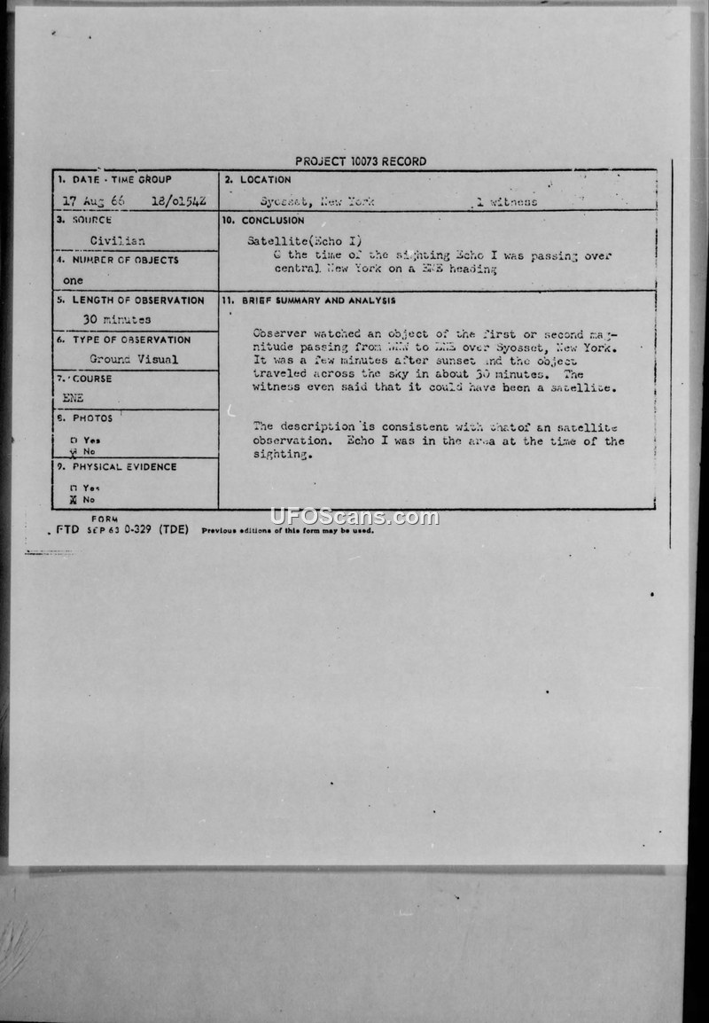 A civilian reported a UFO sighting in Syosset, New York, on August 17, 1966. The Air Force identified the object as the Echo I satellite.