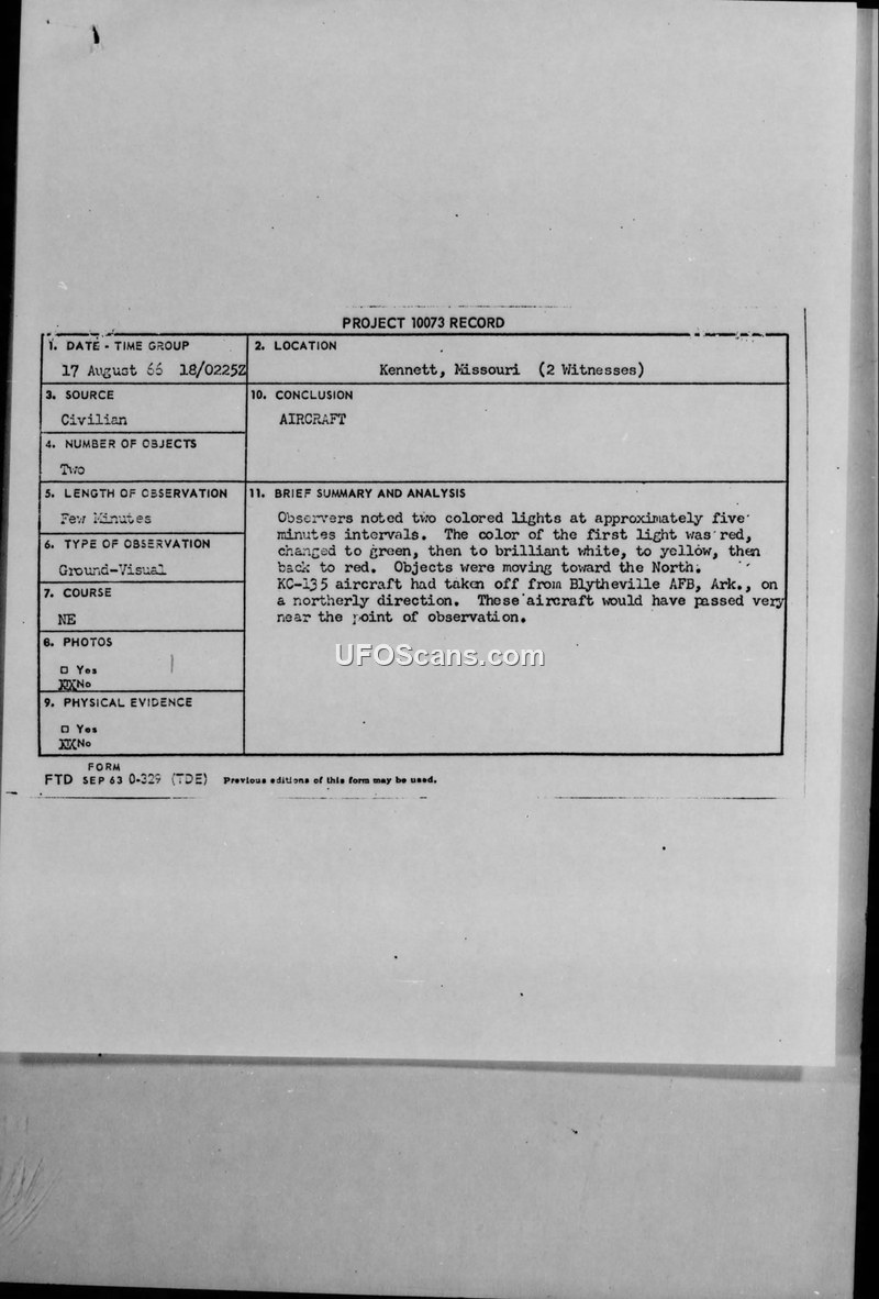 Project 10073 Record — Kennett, Missouri, 17 August 1966