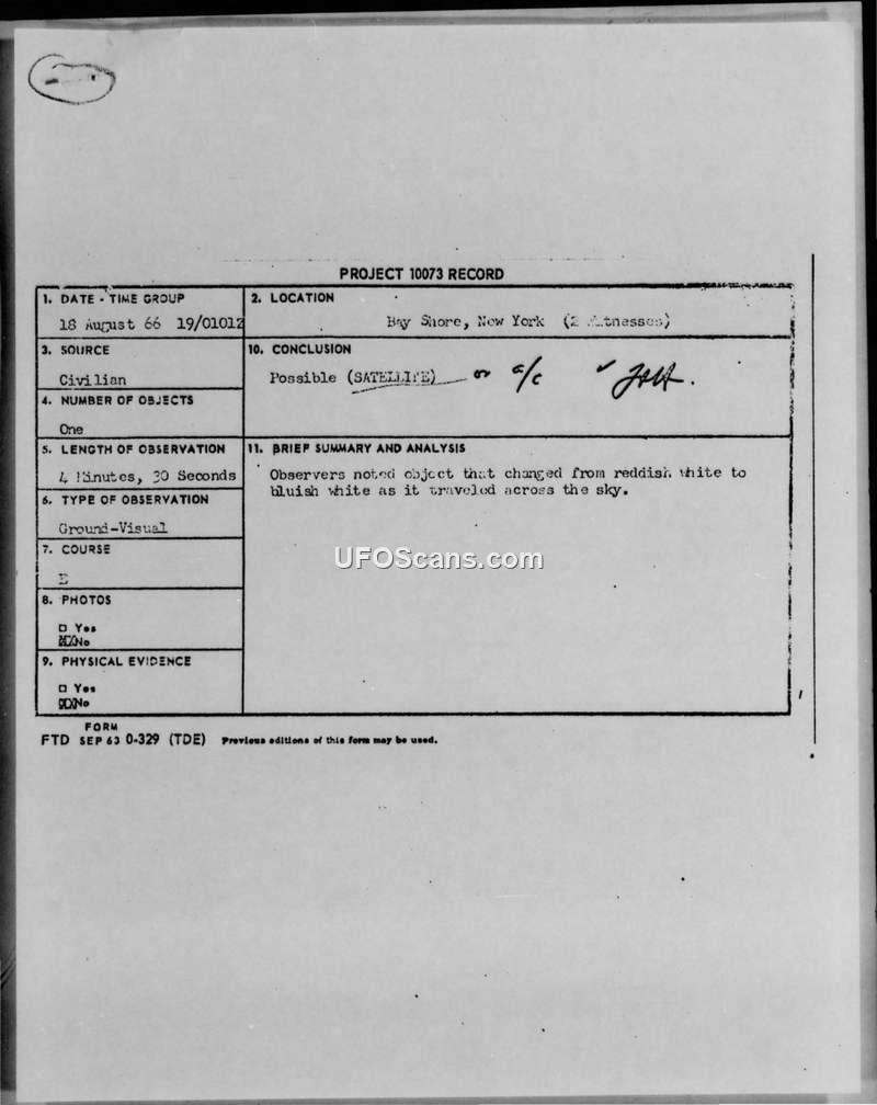Project 10073 Record: Sighting Report - Bay Shore, New York, 18 August 1966