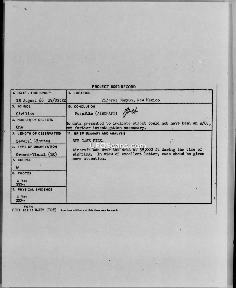 On 18 August 1966, at approximately 1952 local time, a civilian witness in Tijeras Canyon, New Mexico, observed a brilliant white object moving from east to west. The witness, a 48-year-old research illustrator and former commercial pilot with 11,000 hours of flight experience, initially suspected the object was a satellite but ruled this out due to its trajectory. He subsequently identified it as a high-altitude aircraft, though he found the lack of engine noise and the presence of a continuous nose landing light in daylight to be highly unusual. The object was observed to have a large white nose light, a smaller white light beneath it, and a smaller red light above. Later in the observation, a bright rotating white light appeared beneath the object before it suddenly vanished. The witness reported the incident to the FAA and the Air Route Traffic Control Center, neither of which had records of aircraft in the area at that altitude. The Air Force Special Weapons Center at Kirtland Air Force Base investigated the report, noting the witness's professional background and the lack of radar confirmation for the object. The official conclusion recorded on the Project 10073 form was 'Possible (AIRCRAFT),' with a recommendation for further investigation due to the quality of the witness's account.