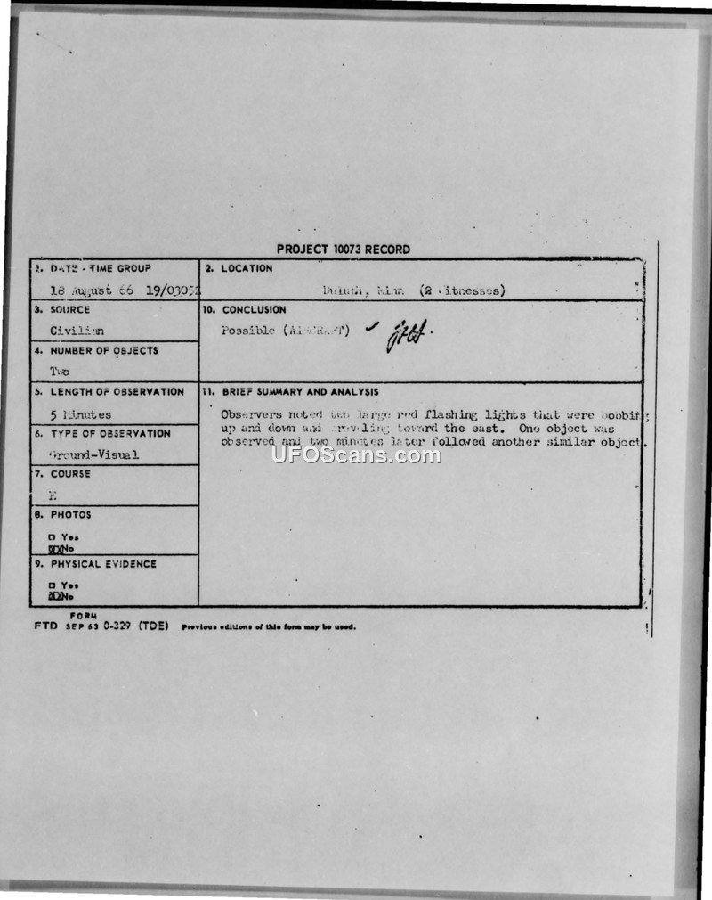 Project 10073 Record — Duluth, Minnesota, 18 August 1966