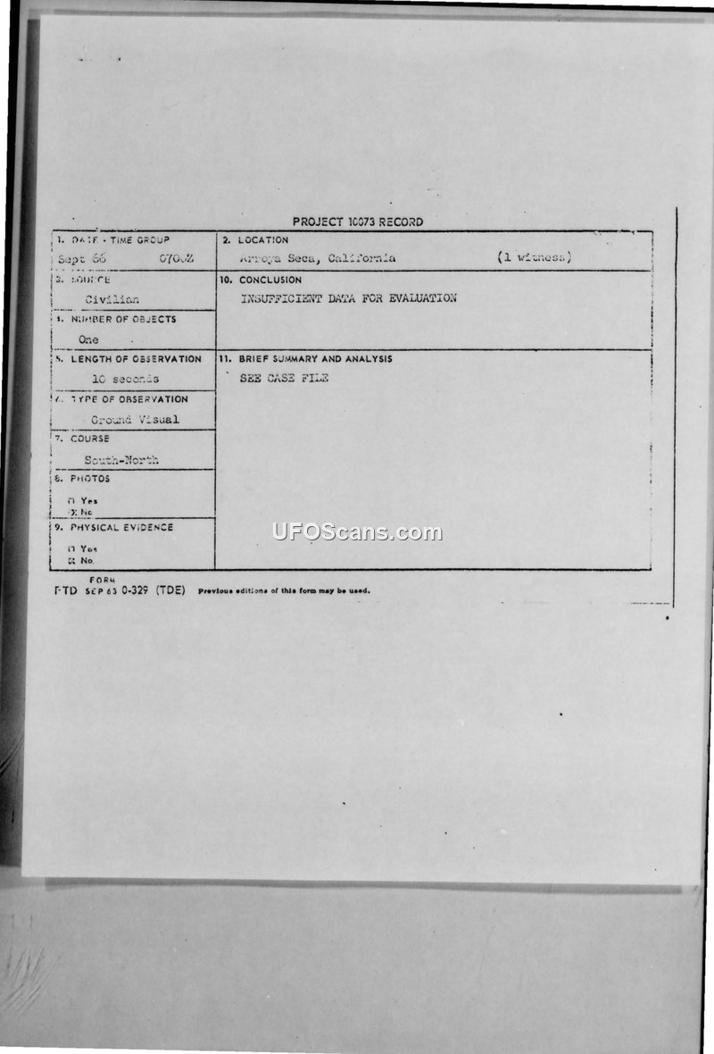 A 13-year-old witness reported a 10-second sighting of a glowing, white, oval object in Arroyo Seca, California, in September 1966. The U.S. Air Force concluded there was insufficient data for evaluation.