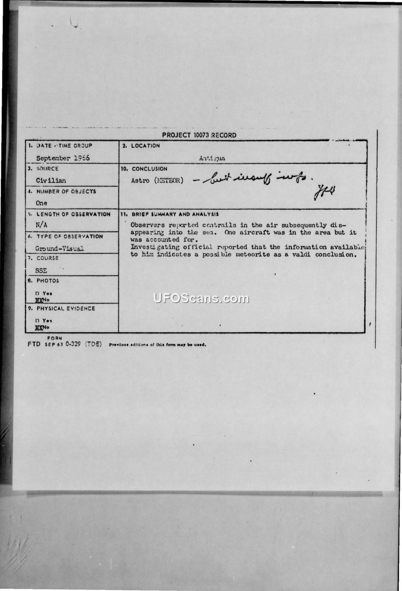 A report from September 1966 regarding a sighting of contrails near Antigua by Eastern Test Range civilians. The event was officially attributed to a possible meteorite.