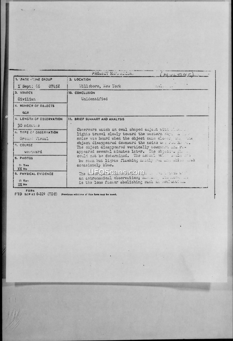 Project Blue Book Sighting Report — Willsboro, New York, September 1, 1966