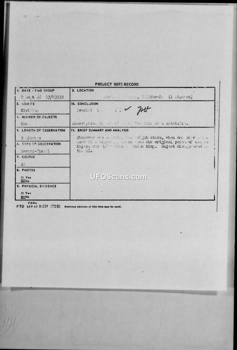 This document is a compilation of Project 10073 records and related correspondence from September 1966, managed by Project Blue Book. It contains multiple reports of Unidentified Aerial Phenomena (UAP) from various locations across the United States, including California, New York, Kansas, and Michigan. The reports involve civilian and military witnesses who observed objects described as round, cigar-shaped, or cylindrical, often with white, silver, or yellowish light. Some witnesses reported the objects moving in zig-zag patterns, while others described straight, constant-speed flight. Several reports mention the presence of a tail or stripes on the objects. The Air Force investigated these sightings, often requesting that witnesses complete FTD Form 164 for further evaluation. In several instances, the Air Force concluded that the objects were balloons, aircraft, or that there was insufficient data to reach a definitive conclusion. Investigating officers, such as Edgar W. Gray and Hollis L. Burgess, noted that they were unable to determine the cause of certain sightings. The correspondence includes letters from Major Hector Quintanilla, Jr., Chief of Project Blue Book, to witnesses, requesting additional information. The document also contains personal narratives from witnesses, including a former USAF A/1C, describing their observations and their attempts to identify the objects, with some witnesses explicitly stating they did not believe the objects were satellites.
