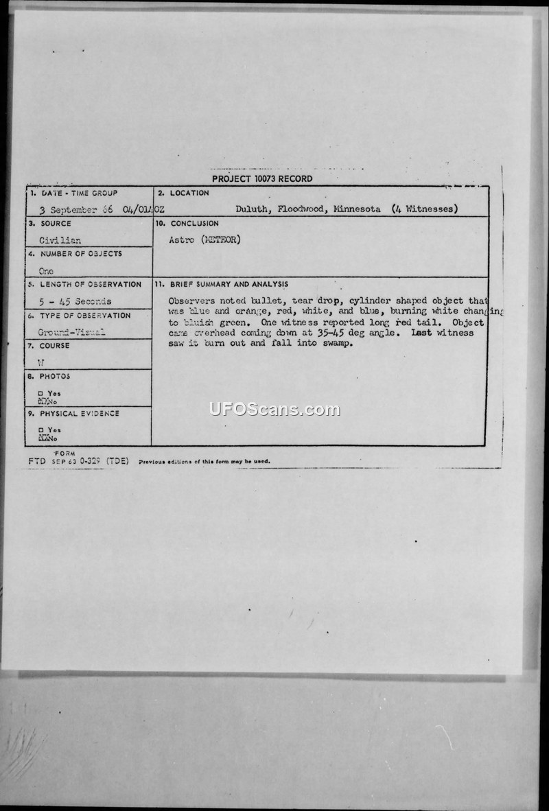 On 4 September 1966, between 0140 and 0150 Zulu, four civilian witnesses observed an unidentified aerial object over Duluth and Floodwood, Minnesota. The witnesses, including a steel worker, a station agent, a highway patrolman, and an Air National Guard member, described the object as a bullet, tear-drop, or cylinder-shaped craft approximately 100 feet in length. The object was reported to be silent and displayed a variety of colors, including blue, orange, red, and white, before changing to a bluish-green color. One witness reported that the object possessed a long red tail. The object was observed moving from east to west, descending at an angle of 35 to 45 degrees, before it appeared to burn out and fall into a swamp. The duration of the sighting was estimated between 5 and 45 seconds. Following the incident, an intelligence officer and two air rescue personnel conducted a search of the area by helicopter on 6 September 1966, but found no physical evidence. The preliminary analysis by the Air Force suggested the object was likely a meteor or ball lightning.