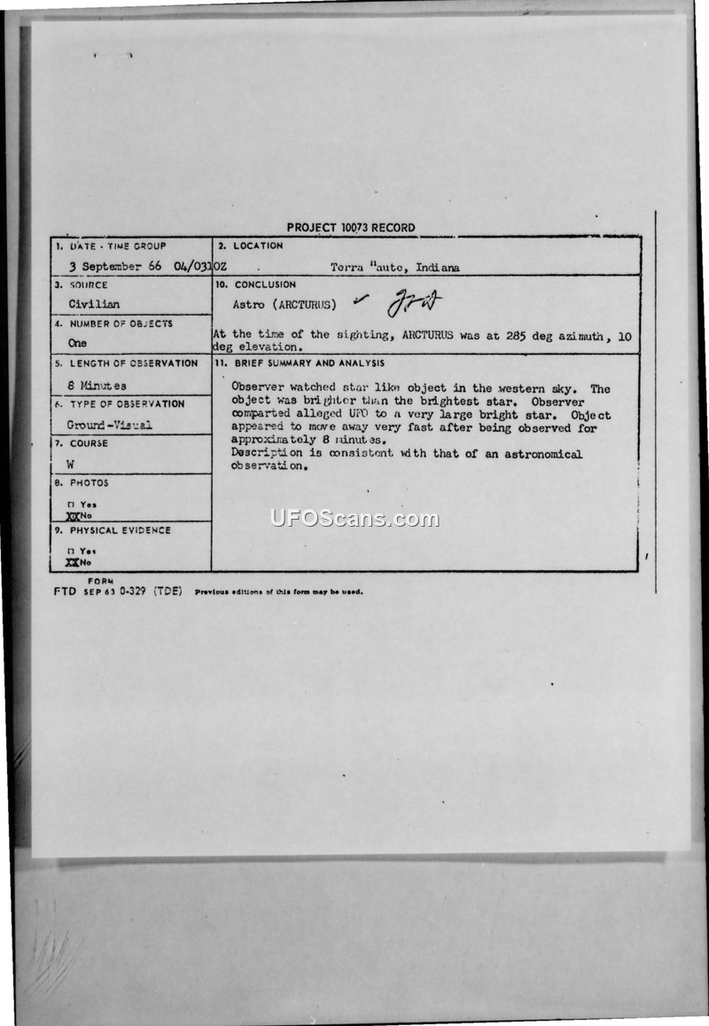 On September 3, 1966, a civilian observer in Terre Haute, Indiana, reported sighting an unidentified flying object. The witness, a student at Indiana State University, observed a brilliant, star-like object in the western sky at approximately 10:10 p.m. The witness initially believed the object to be a star but noted it possessed a distinct brilliance compared to surrounding celestial bodies. The object remained stationary for approximately eight minutes before fading away rapidly. The witness reported the event to Hulman Air Field and subsequently corresponded with Project Blue Book. Major Hector Quintanilla, Jr., Chief of Project Blue Book, requested that the witness complete a formal U.S. Air Force technical information questionnaire. Upon review of the data, the Air Force concluded that the sighting was an astronomical observation of the star Arcturus, which was positioned at 285 degrees azimuth and 10 degrees elevation at the time of the report.
