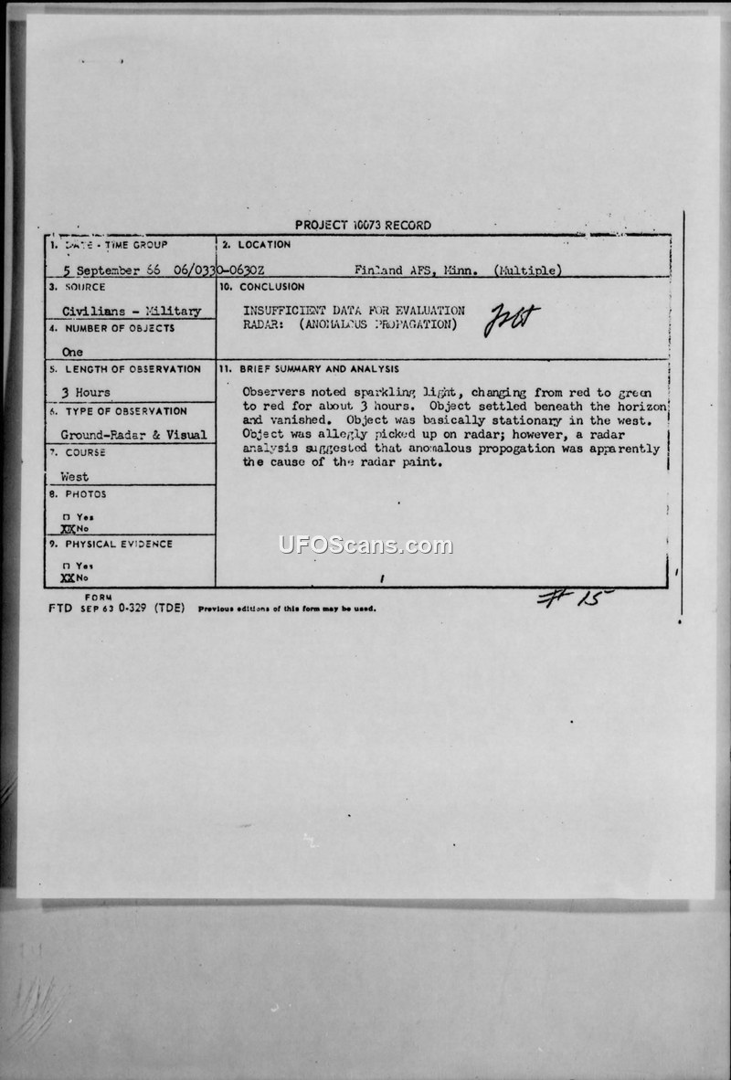 Project 10073 Record: UFO Sighting at Finland AFS, Minnesota
