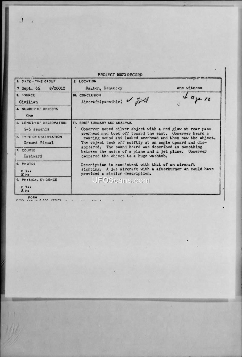Project 10073 Record: Sighting Report - Dalton, Kentucky, 7 September 1966