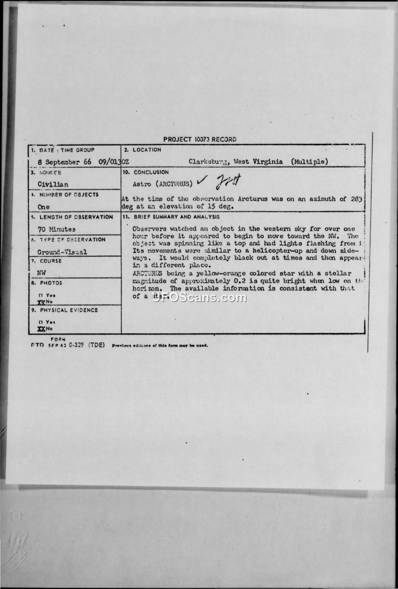 A civilian reported a 70-minute sighting of a 'spinning' object in Clarksburg, West Virginia, on September 8, 1966. The Air Force concluded the object was the star Arcturus.
