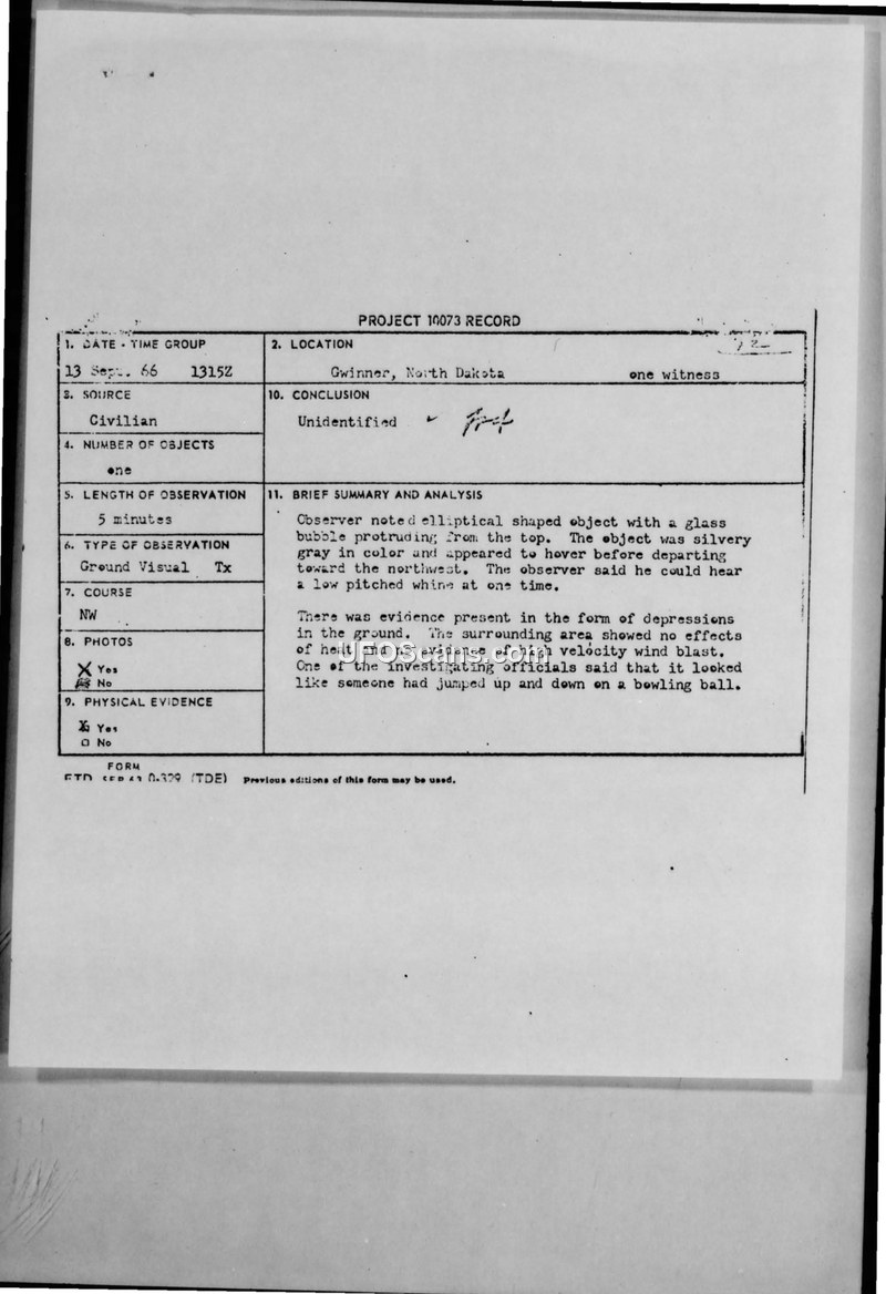 Project 10073 Record — Gwinner, North Dakota, 13 September 1966